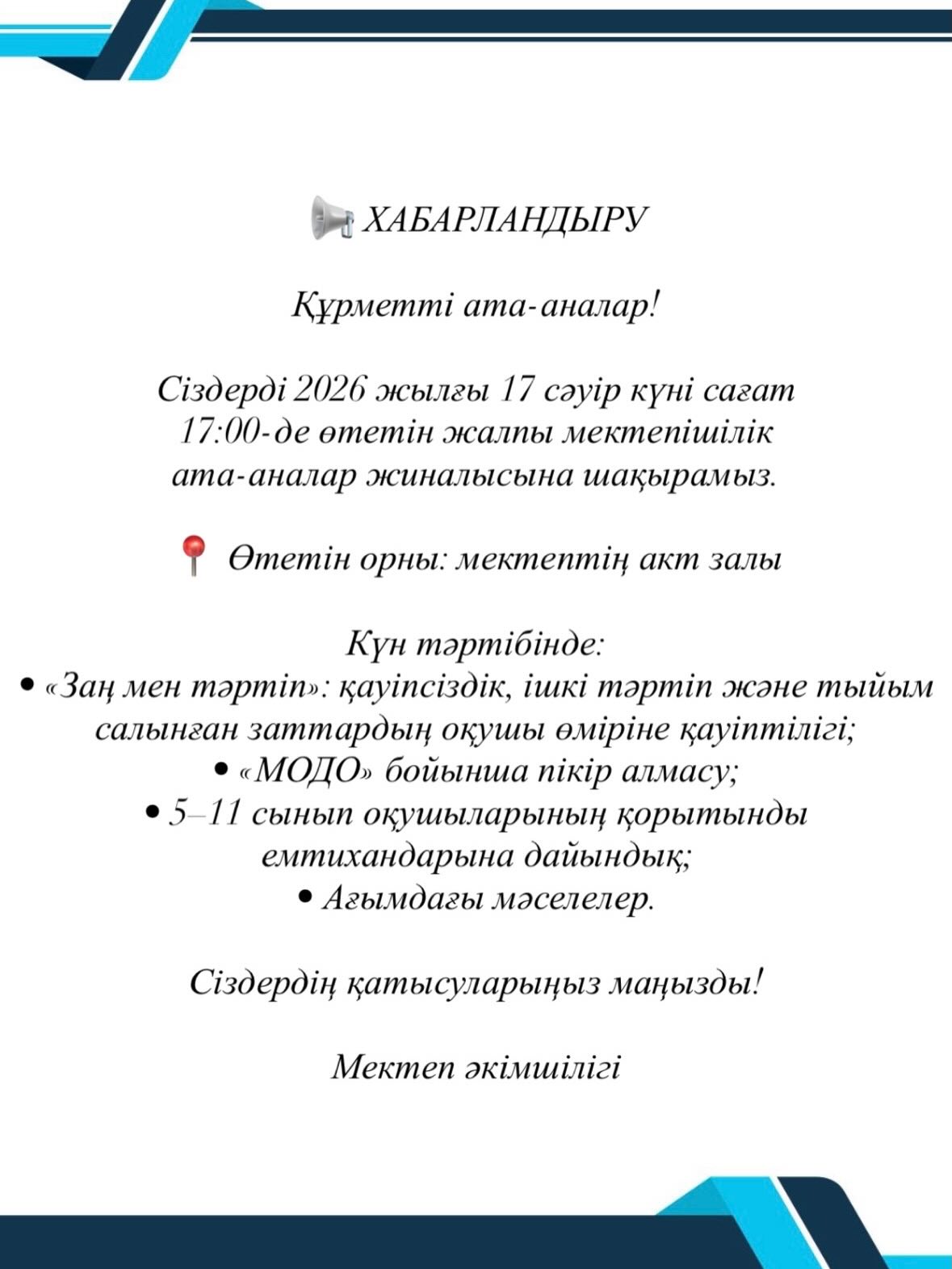Сіздерді 2026 жылғы 17 сәуір күні сағат 17:00-де өтетін жалпы мектепішілік ата-аналар жиналысына шақырамыз.