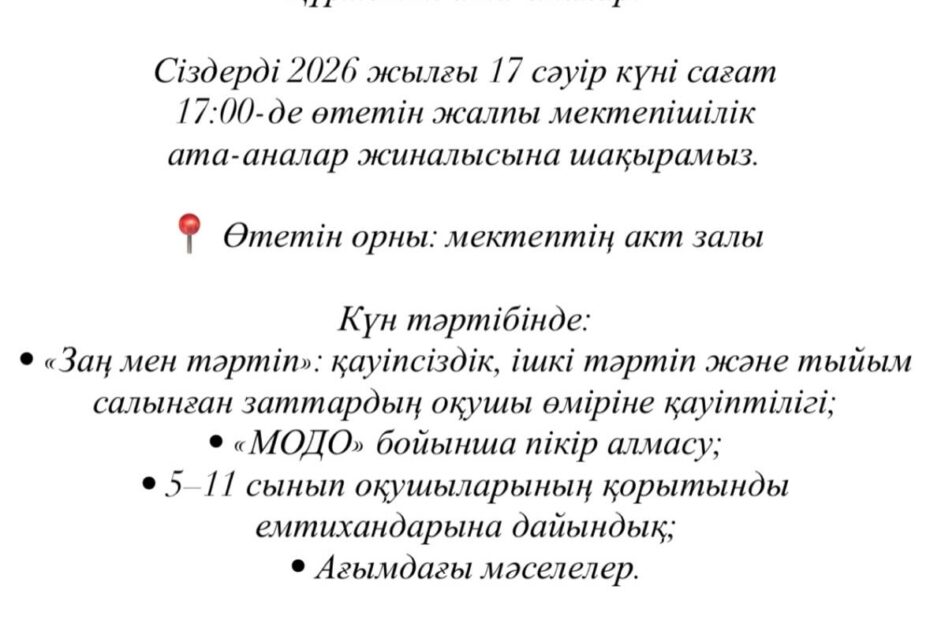 9б сыныбында 3-тоқсан қорытындысы бойынша ата-аналар жиналысы өткізілді. Жиналыс барысында…Сәуір 15, 2026Сәуір 16, 2026