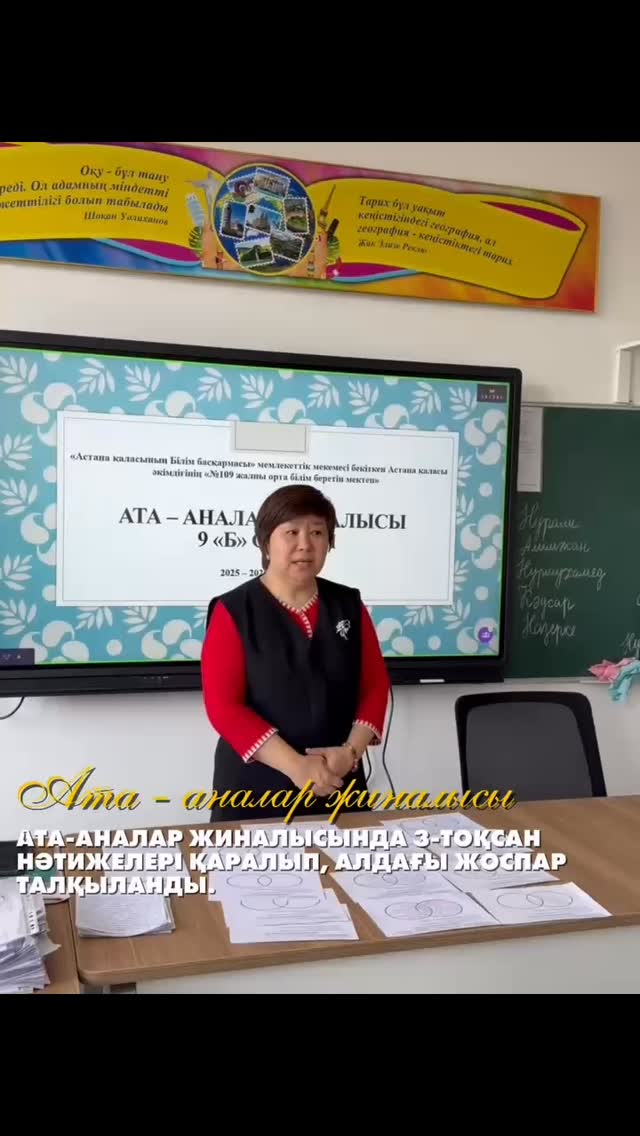 9б сыныбында 3-тоқсан қорытындысы бойынша ата-аналар жиналысы өткізілді. Жиналыс барысында оқушылардың оқу үлгерімі мен білім сапасы жан-жақты талқыланып, нәтижелері бақылауға алынды.